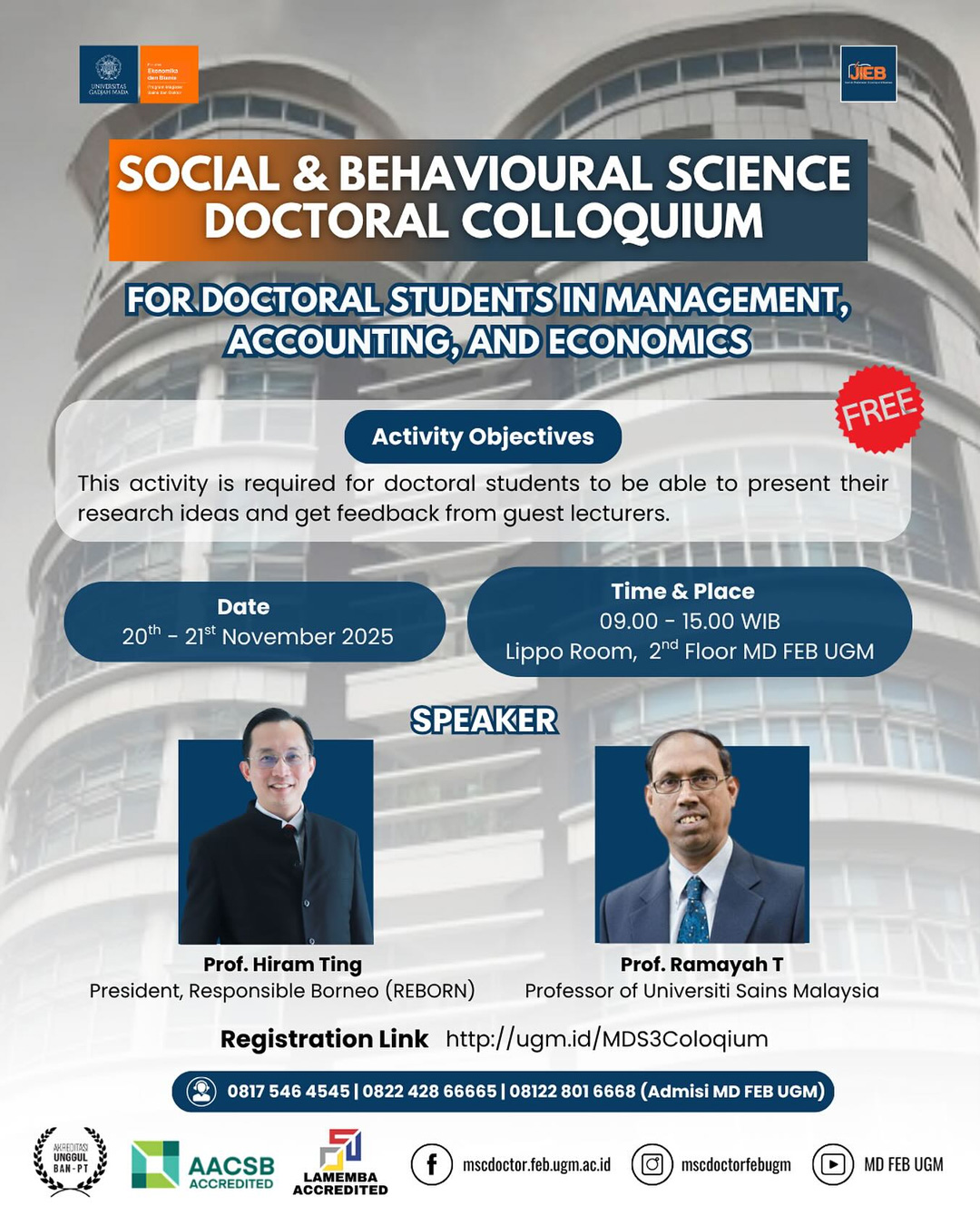 The Doctoral Program of the Faculty of Economics and Business, Universitas Gadjah Mada, will conduct a Doctoral Colloquium on the topic “Social and Behavioral Science.”