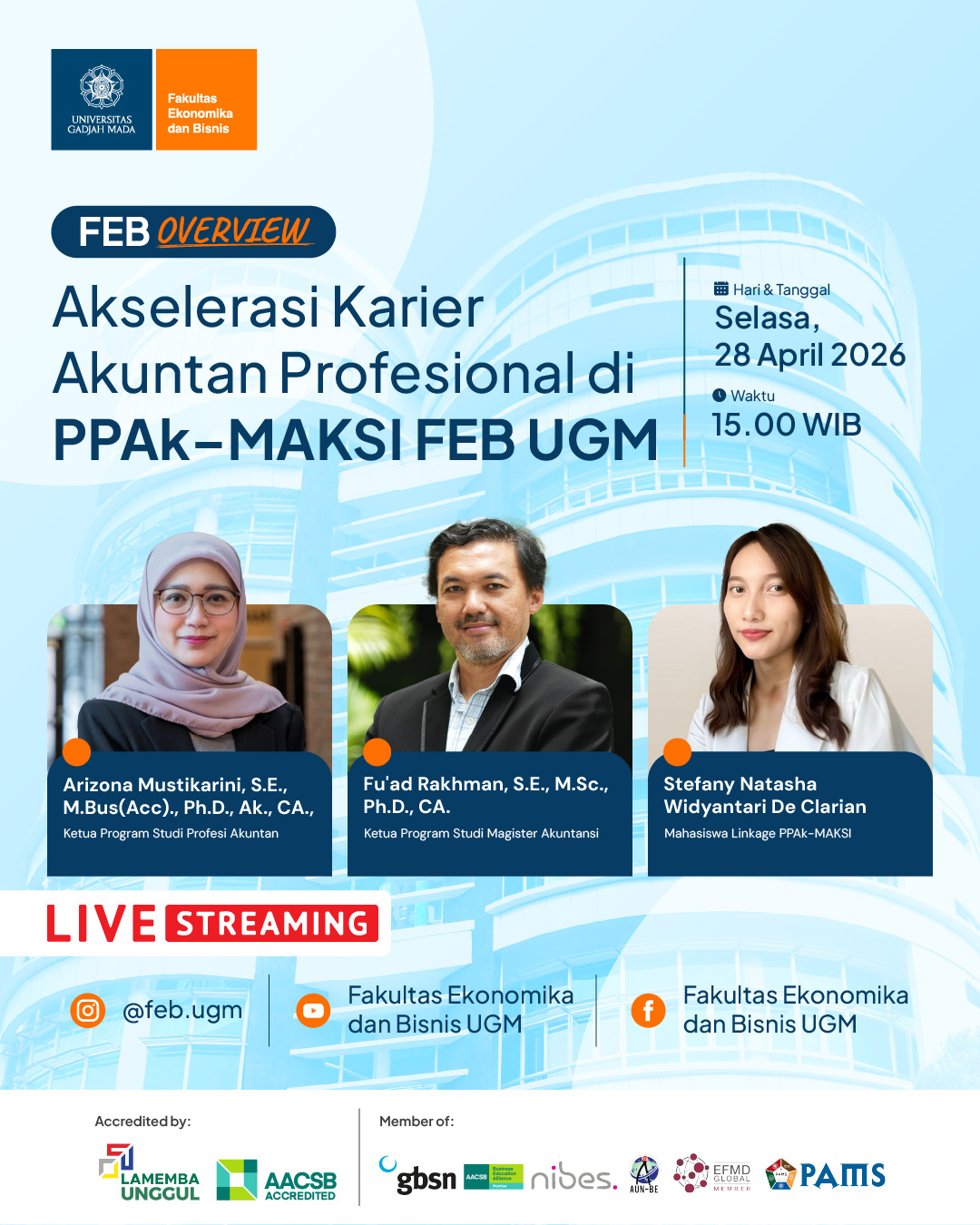 Fakultas Ekonomika dan Bisnis Universitas Gadjah Mada (FEB UGM) bersama Program Studi Profesi Akuntan (PPAk) dan Program Studi Magister Akuntansi (MAKSI) menyelenggarakan acara sosialisasi program studi bertema “Akselerasi Karier Akuntan Profesional di PPAk-MAKSI FEB UGM.”