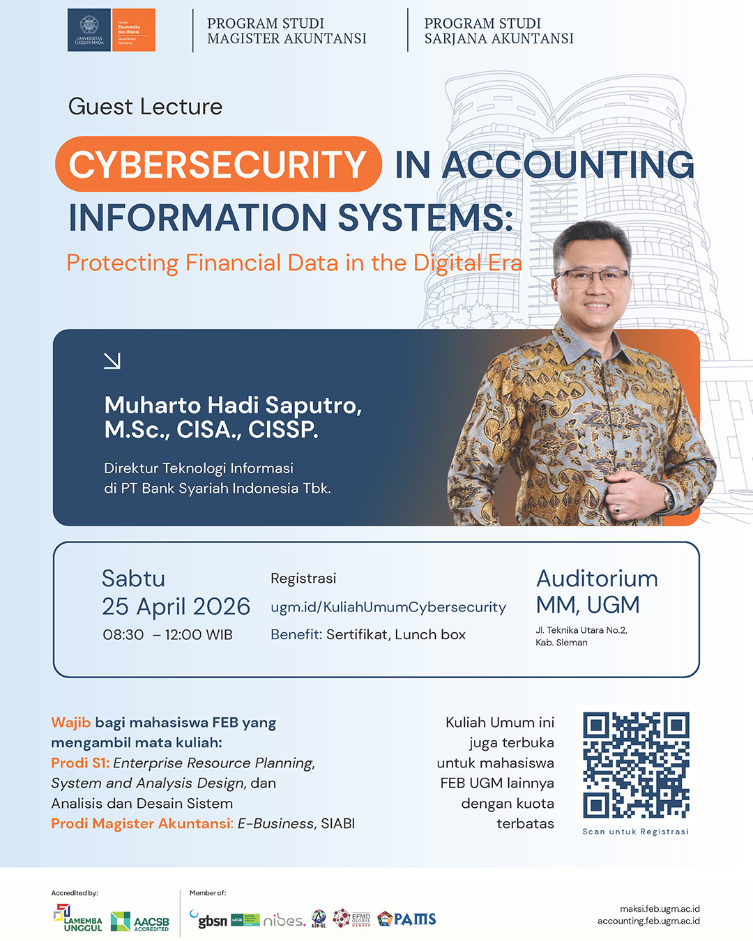 The Faculty of Economics and Business, Universitas Gadjah Mada, will host a Guest Lecture entitled: “Cybersecurity in Accounting Information Systems: Protecting Financial Data in the Digital Era.”