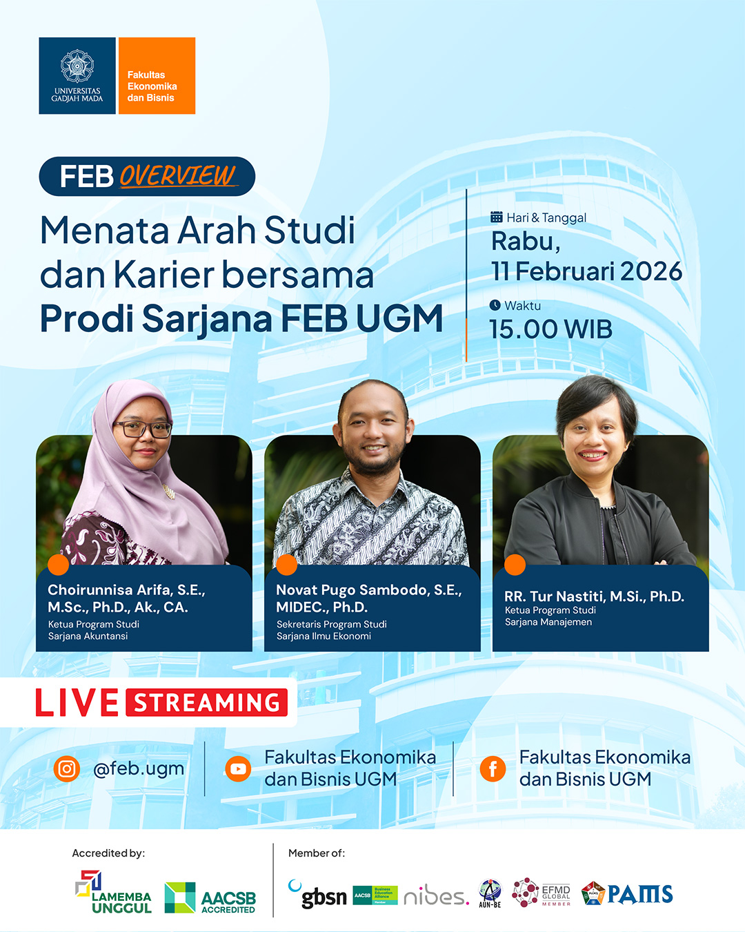 Fakultas Ekonomika dan Bisnis UGM bersama dengan Pengelola Program Sarjana, menyelenggarkan kegiatan sosialisasi program studi sarjana dengan topik “Menata Arah Studi dan Karier bersama Program Studi Sarjana FEB UGM”.