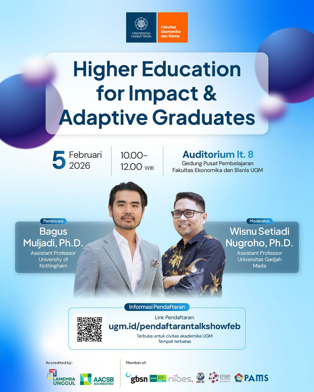The Faculty of Economics and Business, Universitas Gadjah Mada (FEB UGM) will host a Talk Show titled “Higher Education for Impact & Adaptive Graduates.”